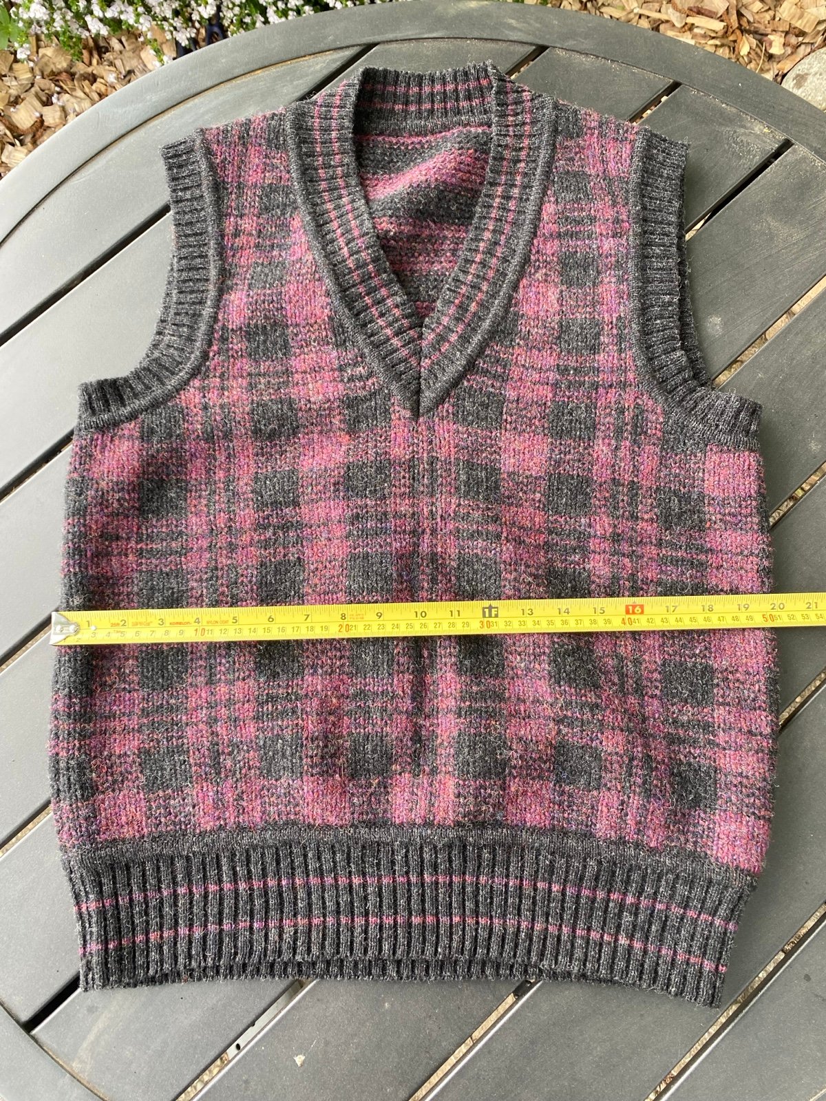 This is a lovely 100% wool sweater vest. Sort of a purplish-pink & gray plaid print. There is no size listing so I took measurements in photos. I am guessing it’s more of a medium then a large. nice sweater in good condition. Non-smoking home.